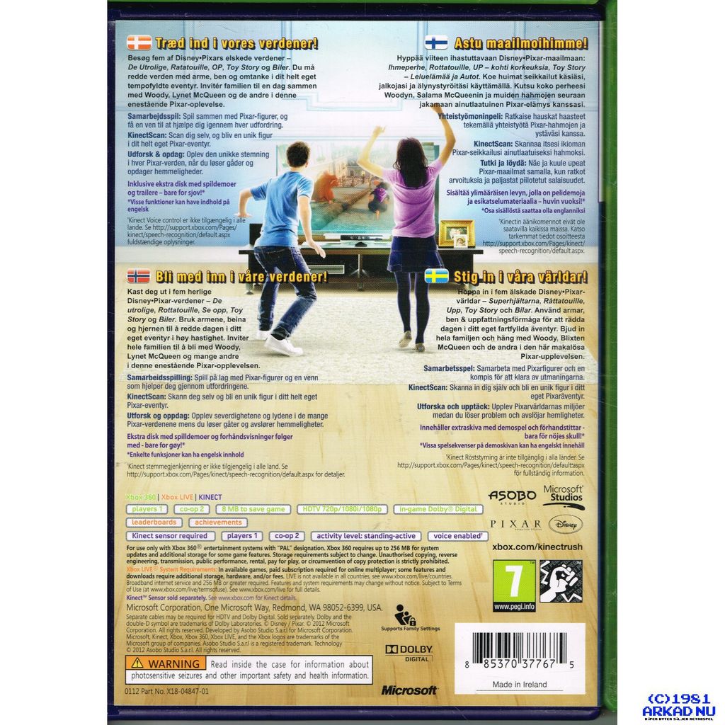 Stig in i Pixars världar med Kinect för Xbox 360. Använd KinectScan och förvandlas till olika karaktärer i fartfyllda actionspäckade äventyr. Använd armarna, benen och hjärnan för att hjälpa dina Pixar-vänner genom fem unika filmvärldar.