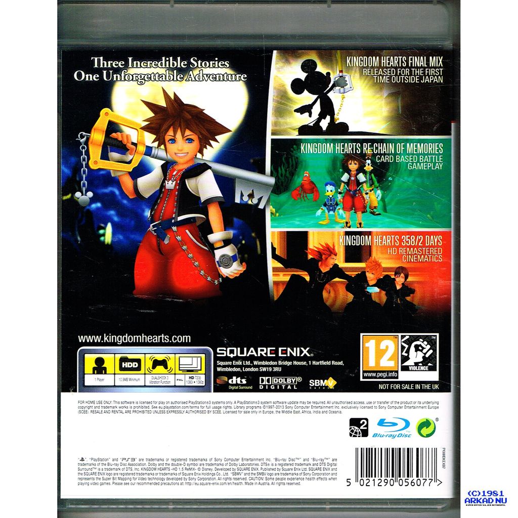 Fully remastered in HD, Kingdom Hearts HD 1.5 ReMIX is a compilation of the critically acclaimed original Kingdom Hearts (in its Kingdom Hearts: Final Mix form, previously exclusive to the Japanese market,) and Kingdom Hearts Re:Chain of Memories. In addition, the two-in-one-disc package features HD cinematic story videos from Kingdom Hearts 358/2 Days, enhanced gameplay mechanics and PlayStation 3 system trophies. Players can now relive the origins of the celebrated franchise with Sora, Riku and the colorful cast of Disney characters, including Mickey, Donald and Goofy!