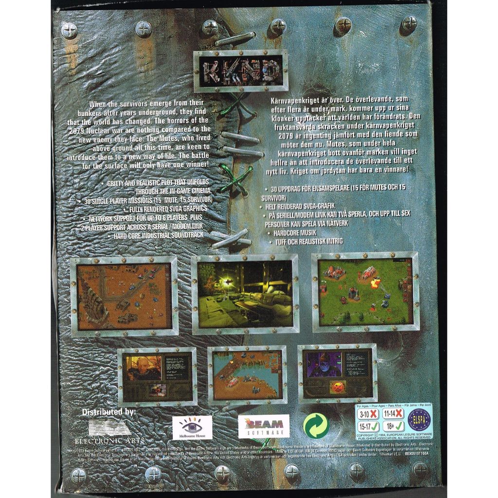 KKnD, or Krush, Kill 'n' Destroy is the first of three real-time strategy games in the KKnD series, and was released on March 25, 1997. The game takes place in a post-apocalyptic setting, where two factions are fighting for control over the few natural resources left. Each faction has its own campaign consisting of 15 missions each, and there is also a multiplayer mode which allows up to 6 people to play via LAN or modem/serial connection.