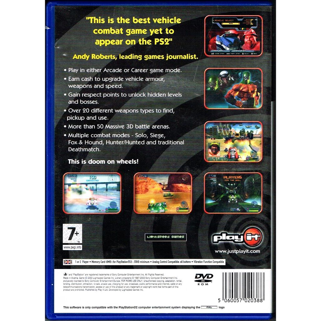 Motorsiege: Warriors of Primetime is a basic vehicle combat game which is controlled in the third person with customizable floating cars. The game includes the standard deathmatch and last-man-standing models plus a new game type called Siege. Siege is basically a variant of capture the flag where vehicle try to take a ball around to different goals without being destroyed or having the ball jarred loose.