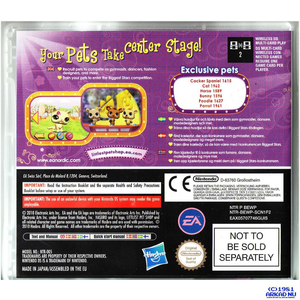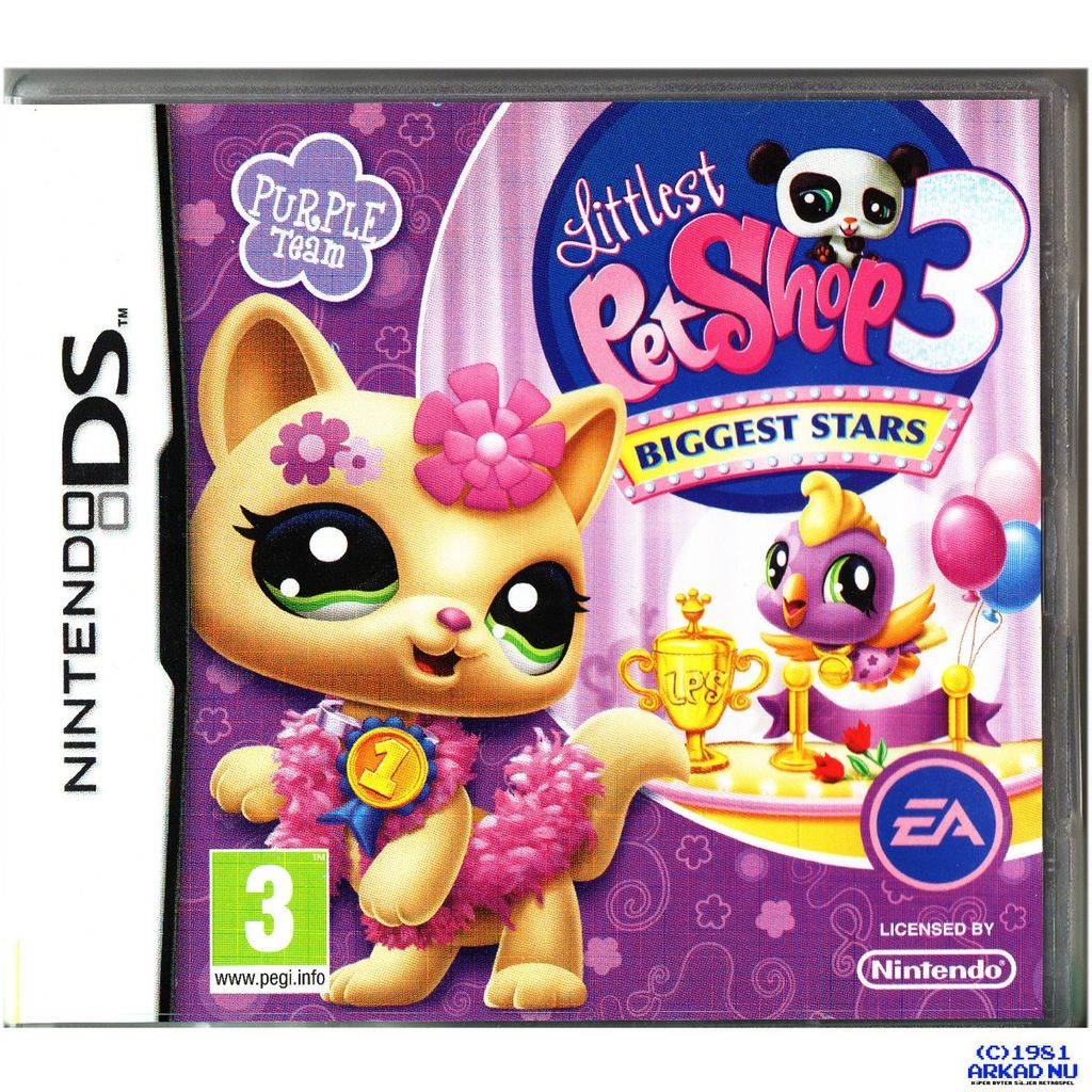Littlest Pet Shop 3: Biggest Stars is three games that include two pets for people with a DSI or 3DS. They are Blue Stars Team with a horse and a poodle, Pink Hearts Team with a cocker spainel and a mouse, and Purple Flowers Team with a cat and a parrot.