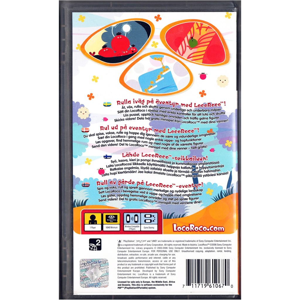 FÀrgglatt, charmigt och fullstÀndigt unikt! LocoRoco Àr ett glatt plattformsspel dÀr du lutar vÀrlden med hjÀlp av PSP:ns knappar för att rulla, hoppa och sjunga dig fram genom fantasifulla miljöer. Samla frukter, undvik fiender och hjÀlp de smÄ LocoRoco-figurerna att rÀdda sin planet frÄn de mörka Moja-fienderna.