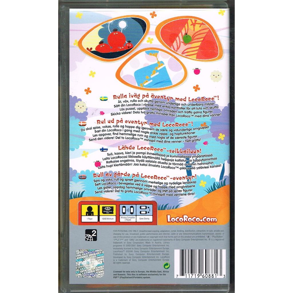 FÀrgglatt, charmigt och fullstÀndigt unikt! LocoRoco Àr ett glatt plattformsspel dÀr du lutar vÀrlden med hjÀlp av PSP:ns knappar för att rulla, hoppa och sjunga dig fram genom fantasifulla miljöer. Samla frukter, undvik fiender och hjÀlp de smÄ LocoRoco-figurerna att rÀdda sin planet frÄn de mörka Moja-fienderna.