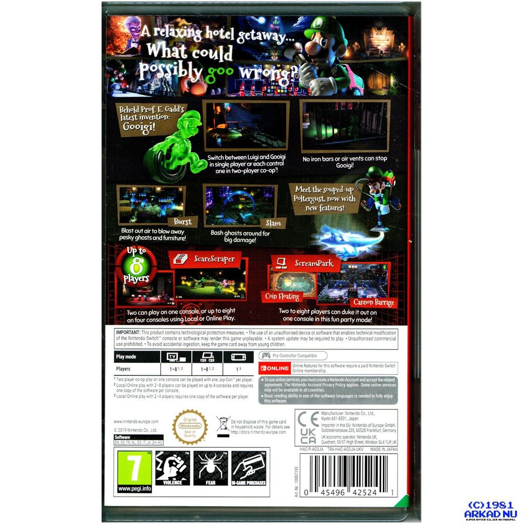 Använd den uppgraderade Poltergust G-00 för att smälla och blåsa bort spökens försvara, eller framkalla Gooigi, en helt grön doppelgänger som kan hjälpa Luigi att övervinna hinder han inte kan komma förbi ensam. Byta mellan Luigi och Gooigi som en spelare, eller spela med en vän och kontrollera en var. För mer frenetisk multiplayer-action, tävla mot klockan för att klara olika mål på en serie våningar i ScareScraper-läget. ScareScraper-läget kan spelas online* eller lokalt med upp till 8 spelare på fyra Nintendo Switch-konsoler (ytterligare spel krävs, säljs separat).