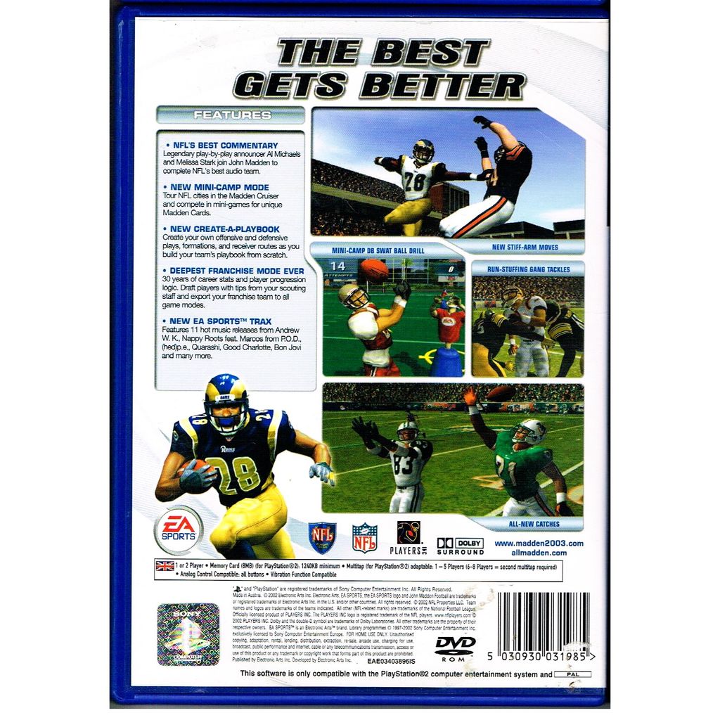 Madden NFL 2003 is an American football simulation video game based on the NFL that was developed by EA Tiburon and Budcat Creations and published by EA Sports. The 14th installment of the Madden NFL series, the game features former St. Louis Rams running back Marshall Faulk on the cover. This edition of Madden was the first to have EA Trax, the Mini Camp mode and to feature John Madden and Al Michaels as commentators, who took over for Pat Summerall. The game was released on August 12, 2002 for the Game Boy Advance, Microsoft Windows, Nintendo GameCube, PlayStation, PlayStation 2 and the Xbox.