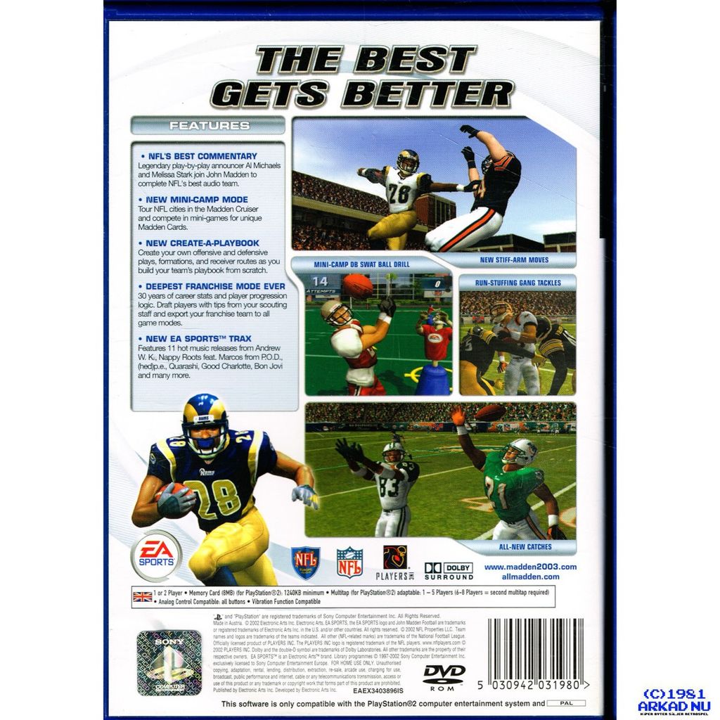 Madden NFL 2003 is an American football simulation video game based on the NFL that was developed by EA Tiburon and Budcat Creations and published by EA Sports. The 14th installment of the Madden NFL series, the game features former St. Louis Rams running back Marshall Faulk on the cover. This edition of Madden was the first to have EA Trax, the Mini Camp mode and to feature John Madden and Al Michaels as commentators, who took over for Pat Summerall. The game was released on August 12, 2002 for the Game Boy Advance, Microsoft Windows, Nintendo GameCube, PlayStation, PlayStation 2 and the Xbox.