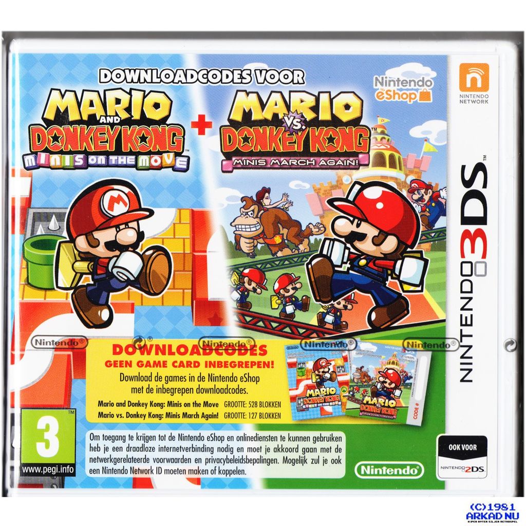 Mario and Donkey Kong: Minis on the Move + Mario vs. Donkey Kong: Minis March Again! is a physical bundle containing Nintendo 3DS eShop download codes for Mario and Donkey Kong: Minis on the Move and Mario vs. Donkey Kong: Minis March Again! It was released exclusively in Europe and Australia.