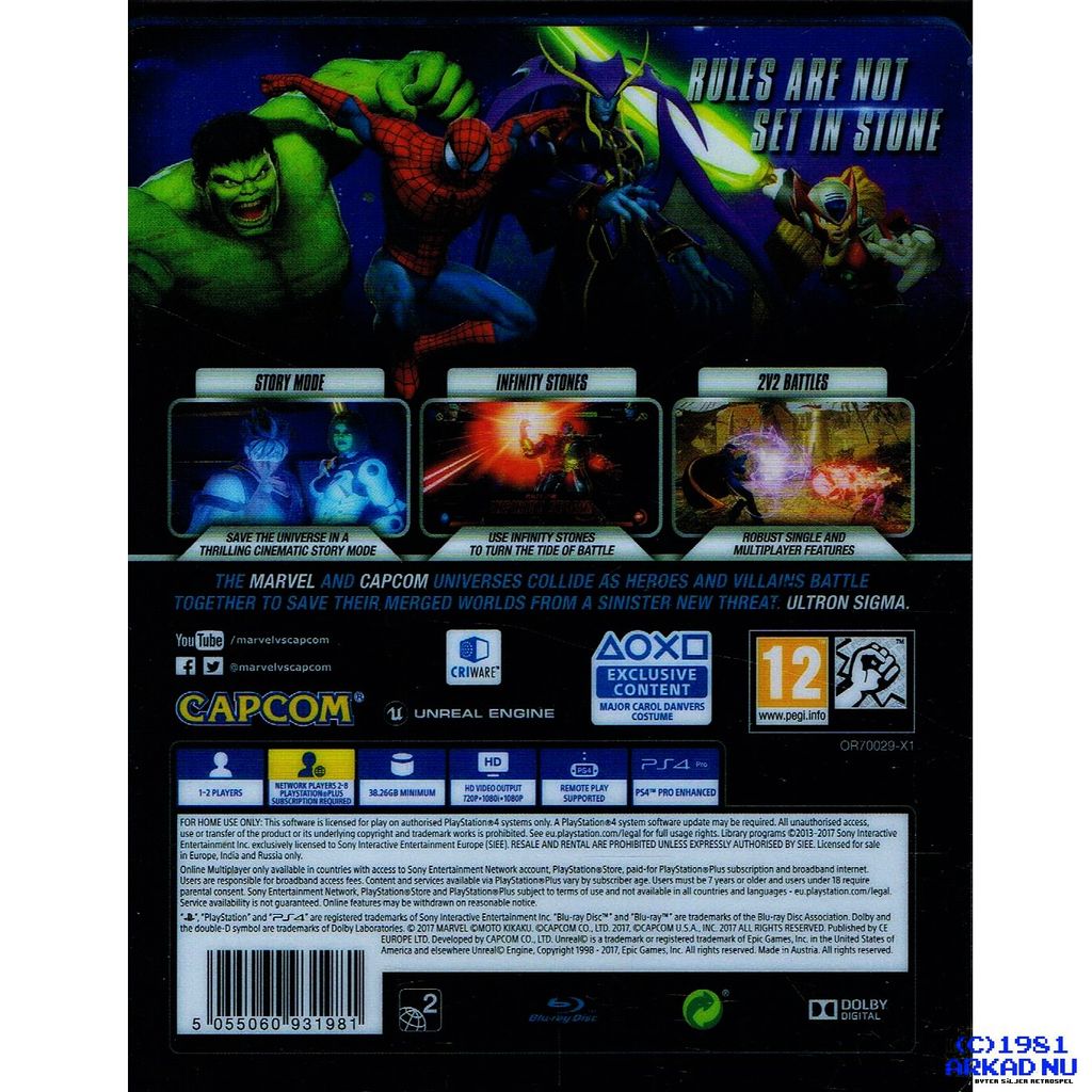 Det episka mötet mellan två universum återvänder i Marvel vs. Capcom: Infinite, nästa era av den hyllade action-fighting-serien. Marvels och Capcoms universum kolliderar som aldrig förr och tvingar ikoniska karaktärer att samarbeta i actionspäckade flerspelarstrider. Ultron Sigma har inlett utrotningen av allt biologiskt liv. Mot alla odds står hjältarna tillsammans mot det ultimata hotet, och deras enda hopp vilar hos de allsmäktiga Infinity Stones. Följande PS4™-exklusiva innehåll ingår: 'Major Carol Danvers Costume for Captain Marvel'.
