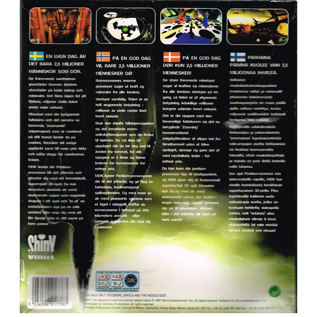 MDK is a 1997 third-person shooter video game developed by Shiny Entertainment for Microsoft Windows. It was ported to Mac OS by Shokwave, and to the PlayStation by Neversoft. It was published on all systems by PIE in North America, with Shiny Entertainment publishing it themselves in Europe. The Windows version was released in April 1997, the Mac version in June and the PlayStation version in November. The game was released on GOG.com in September 2008,and on Steam in September 2009.