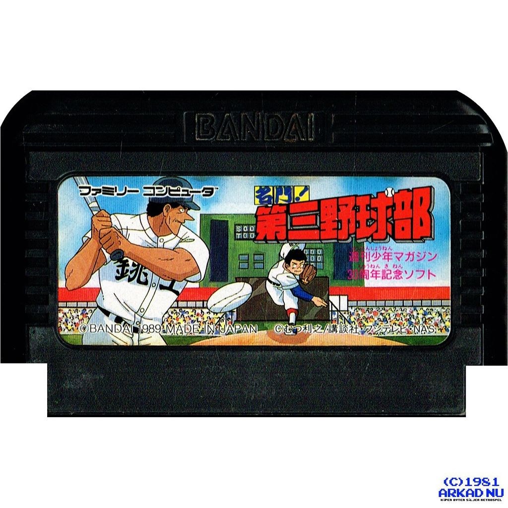 Meimon! Daisan Yakyuubu ("Meimon! The Third Baseball Club") is a baseball sim for the Famicom that is based on a manga and anime of the same name about an underdog highschool baseball team and the drama that surrounds them. The player can access the game's story mode, which depicts scenes from the manga, by selecting "Dramatic Mode" from the title screen menu. This also adds character portraits to the main game mode.