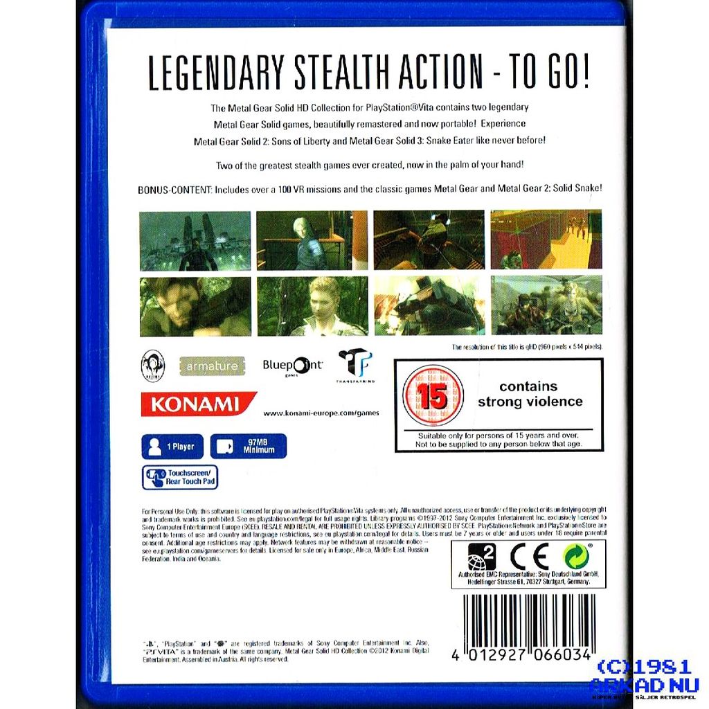 Från den kritikerrosade regissören Hideo Kojima, innehåller Metal Gear Solid: HD Collection för Playstation Vita två av de mest populära Metal Gear Solid-spelen från det förflutna i HD. Med både Metal Gear Solid 2: Sons of Liberty och Metal Gear Solid 3: Snake Eater, erbjuder HD Collection spelarna en chans att uppleva den episka designen och berättandet av MGS-serien med helt nya funktioner, inklusive optimerade kontroller som är avsedda att ta nytta av Vitas touch-screen-funktioner, ett ombalanserat användargränssnitt, tillsammans med troféer och sparningar som kan delas med PS3-versionen av MGS HD Collection.