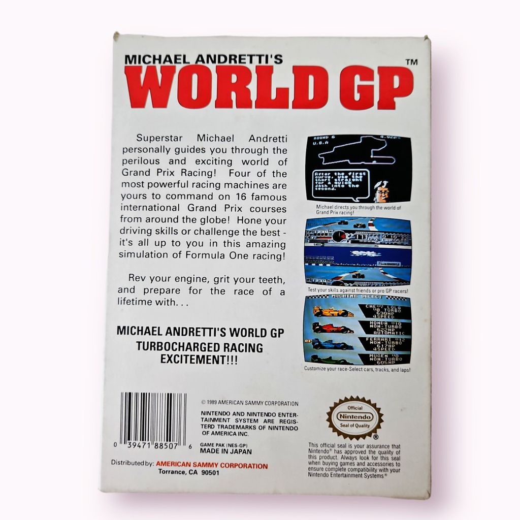 Michael Andretti's World GP features 16 unique courses located in Brazil, San Marino, Monaco, Mexico, Canada, United States, France, England, West Germany, Hungary, Belgium, Italy, Portugal, Spain, Japan, and Australia. Each track can be played either in single player mode or in head-to-head 2-player action on a split screen. There are 4 different cars to choose from and manual shifting is a consideration during racing, a facet often overlooked in simpler NES racing game scenarios. While the star of the game is Michael Andretti, who pops in before each race to offer useful advice about the current track, the game also has appearances by many other F-1 racing stars.