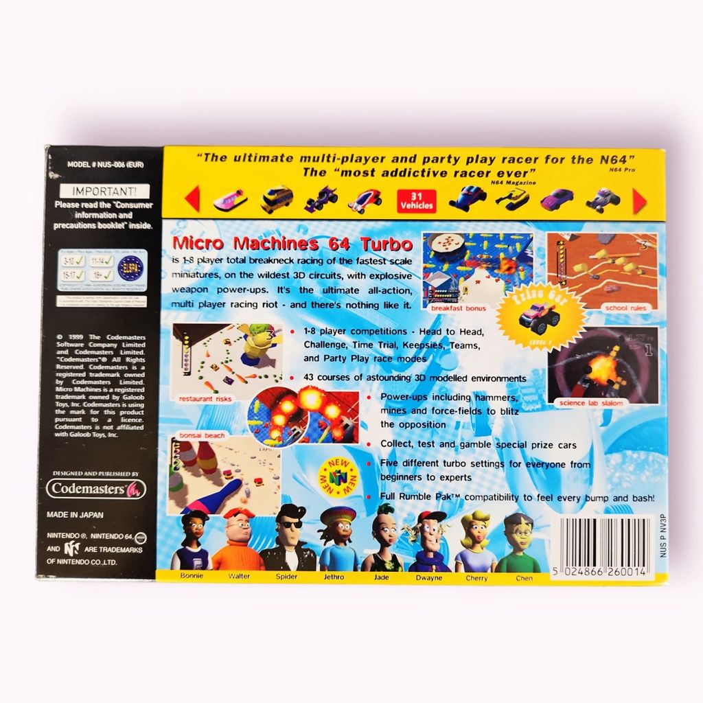 Conversion of Micro Machines V3, with added extras exclusive to the N64 version.