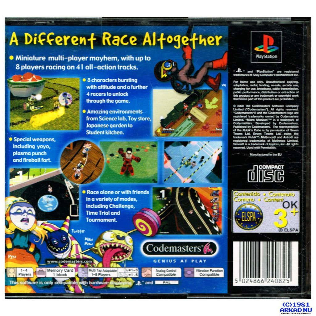 Micro Maniacs (FoxKids.com Micro Maniacs Racing in North America) is a racing video game developed by Codemasters for PlayStation and Game Boy Color. It is a spin-off to the Micro Machines games, the main difference being that players control tiny characters where a few racetracks feature the use of vehicles. The North American version was sponsored by Fox Kids, and so the game's name was changed there. It was scheduled to be released in June 2000,but was delayed to late September.