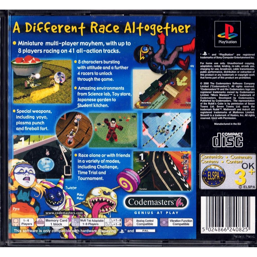 Micro Maniacs (FoxKids.com Micro Maniacs Racing in North America) is a racing video game developed by Codemasters for PlayStation and Game Boy Color. It is a spin-off to the Micro Machines games, the main difference being that players control tiny characters where a few racetracks feature the use of vehicles. The North American version was sponsored by Fox Kids, and so the game's name was changed there. It was scheduled to be released in June 2000,but was delayed to late September.
