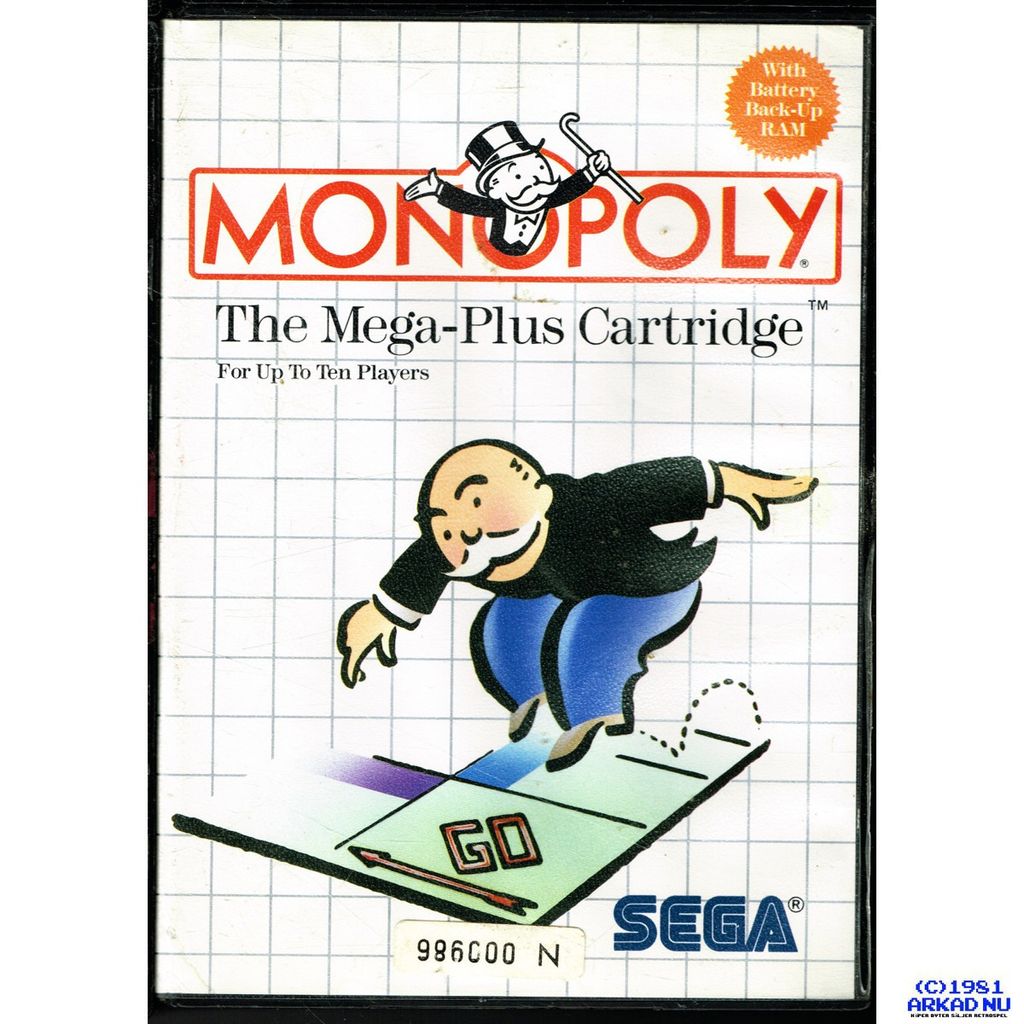Monopoly is a licensed game based upon the Monopoly board game, and was developed by Nexa and published by Sega for the Sega Master System. Up to 10 players can play in a single game, any of whom can be computer-controlled. The cartridge features a battery back-up RAM, so games can be saved and resumed later.