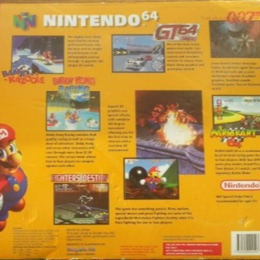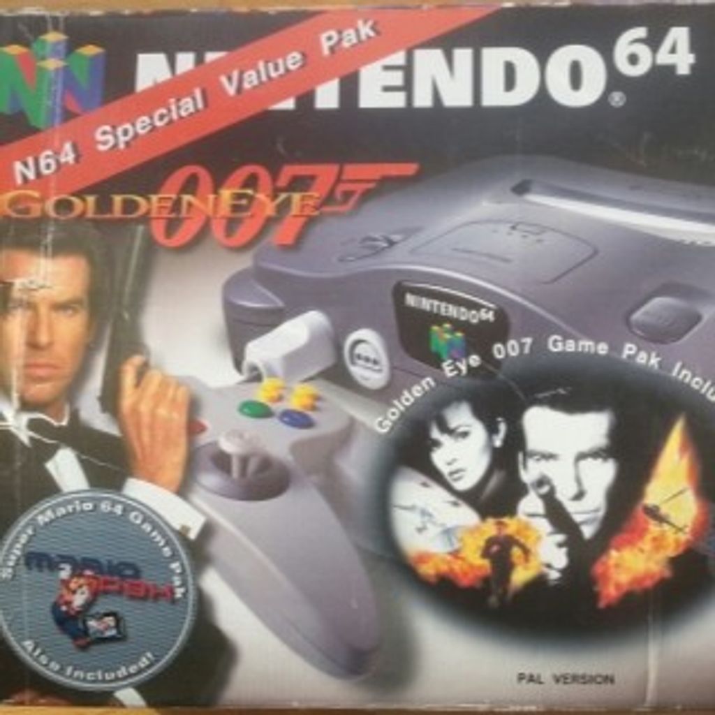Levereras med spelen Goldeneye (Rareware) och Super Mario 64, en handkontroll, bildkabel och Jumperpack.