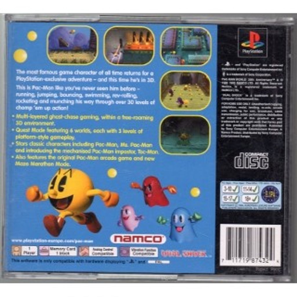 Pac-Man World (officially called Pac-Man World 20th Anniversary) is a 1999 3D-based free roaming platform game for the PlayStation. As the name indicates, the game was released to coincide with the 20th anniversary of the Pac-Man character. A Game Boy Advance version would be released in 2004, with many features removed.