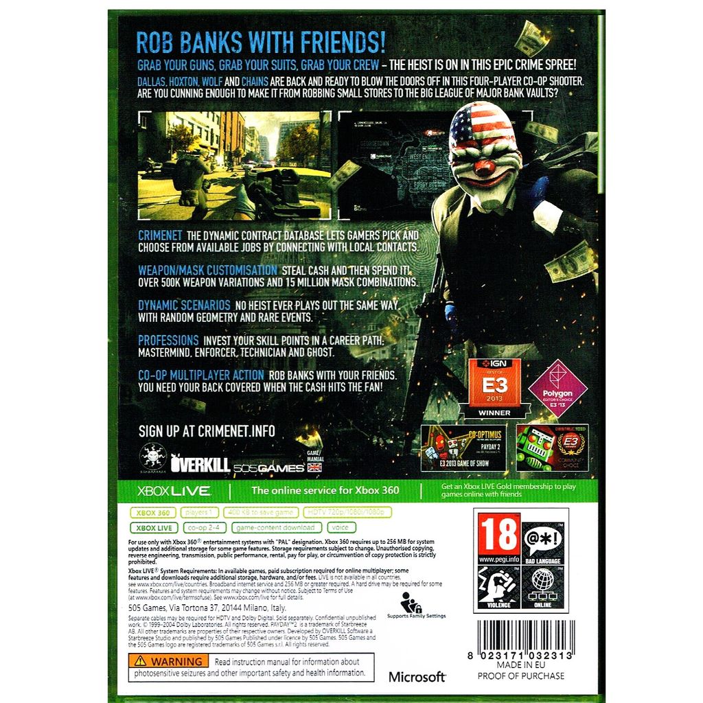Payday 2 is a cooperative first-person shooter video game developed by Overkill Software and published by 505 Games has former published by Sony. The game is a sequel to 2011's Payday: The Heist. It was released on 13 August 2013 for Microsoft Windows, PlayStation 3 and Xbox 360. An improved version of the game, subtitled Crimewave Edition, was released for PlayStation 4 and Xbox One in June 2015 (on 12 June in the UK and Europe and on 16 June in North America).The game has been announced for the Nintendo Switch and will come out in February 2018.
