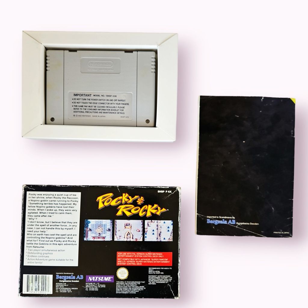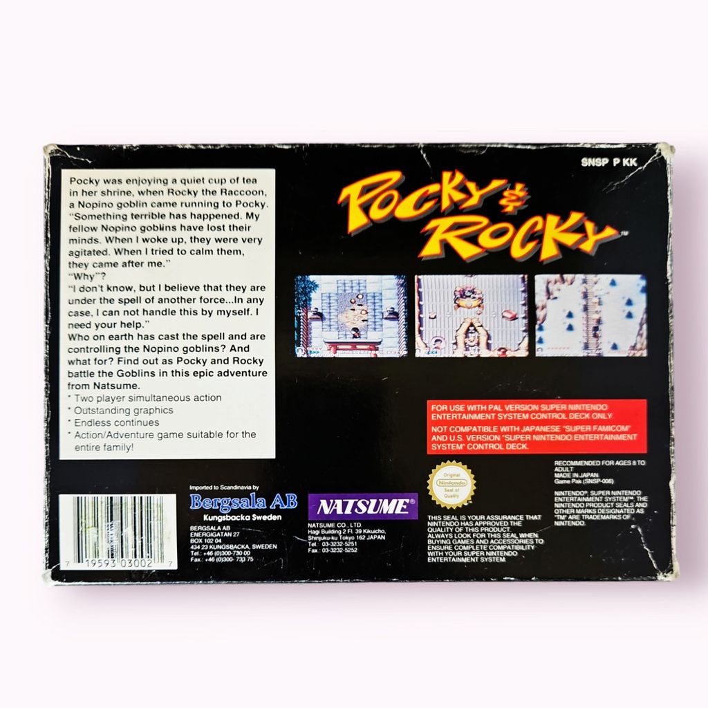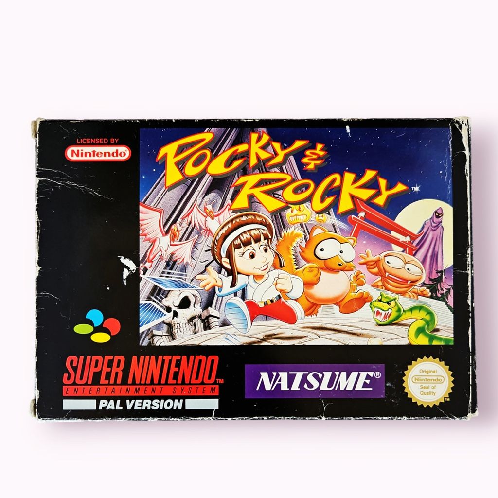 Pocky & Rocky is a 1992 scrolling shooter video game developed by Natsume for the Super Nintendo Entertainment System. It is the sequel to the 1986 arcade game KiKi KaiKai developed by Taito. Pocky & Rocky follows the adventures of a young Shinto shrine maiden named Pocky and her new companion, Rocky the Tanuki as they attempt to save a group of creatures known as the Nopino Goblins. Gameplay takes place from a top-down perspective and features both single-player and cooperative modes. The game was generally well received by critics, and was followed by a sequel in 1994, Pocky & Rocky 2.