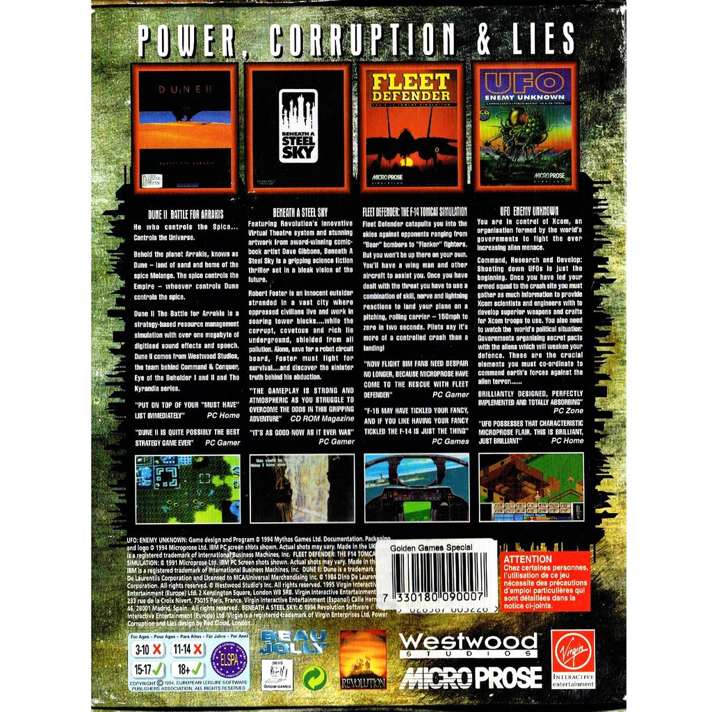 Beskrivning av POWER, CORRUPTION AND LIES - BENEATH A STEEL SKY - DUNE II - UFO ENEMY UNKNOWN - F14 FLEET COMMANDER PC BIGBOX
