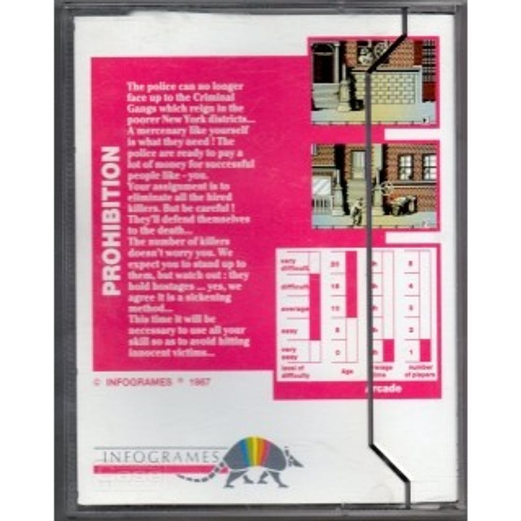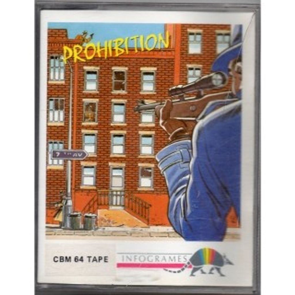 Prohibition is a very early example of a first-person shooter where the player moves a gunsight around the playing area(which is a backdrop of dingy New York street of tenements several screens wide) and tries to take out as many appearing members of a criminal gang as possible before they can return fire.