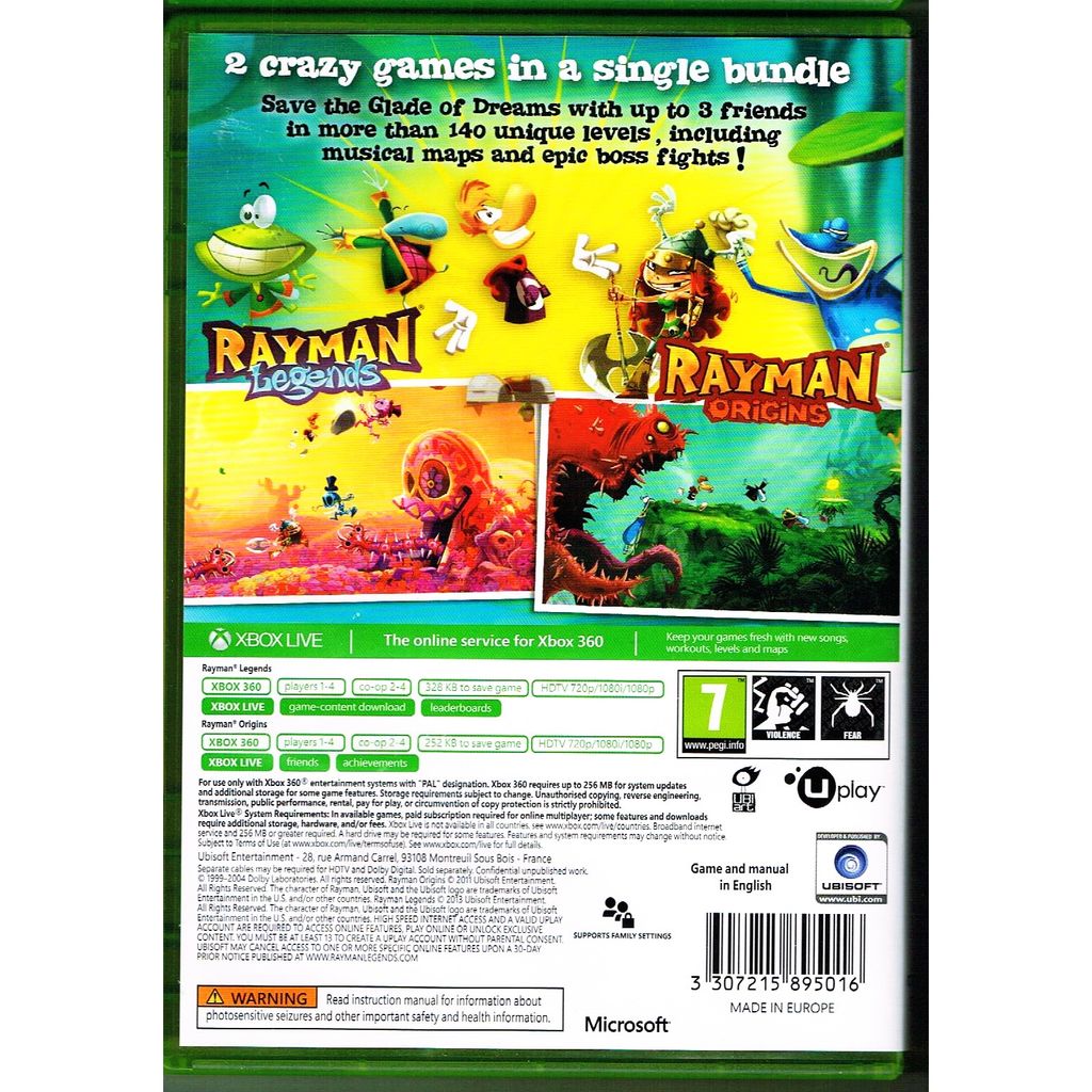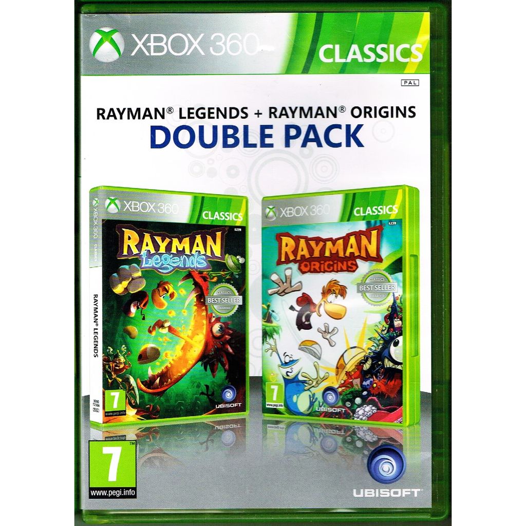 The Rayman Origins & Rayman Legends Double Pack is a compilation of the two Rayman games Rayman Origins and Rayman Legends released on PC, the Sony Playstation 3, Sony Playstation Vita and Xbox 360 in Europe.