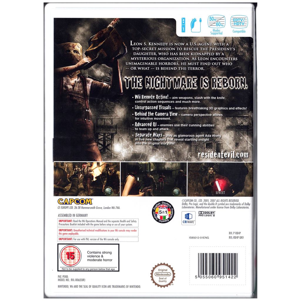 Följ med Leon S. Kennedy på en livsfarlig räddningsaktion i en av de mest hyllade survival horror-titlarna någonsin. Wii-versionen kombinerar den kritikerrosade spelupplevelsen med intuitiva rörelsekontroller och extra innehåll från tidigare utgåvor. Upplev skräcken på ett helt nytt sätt!