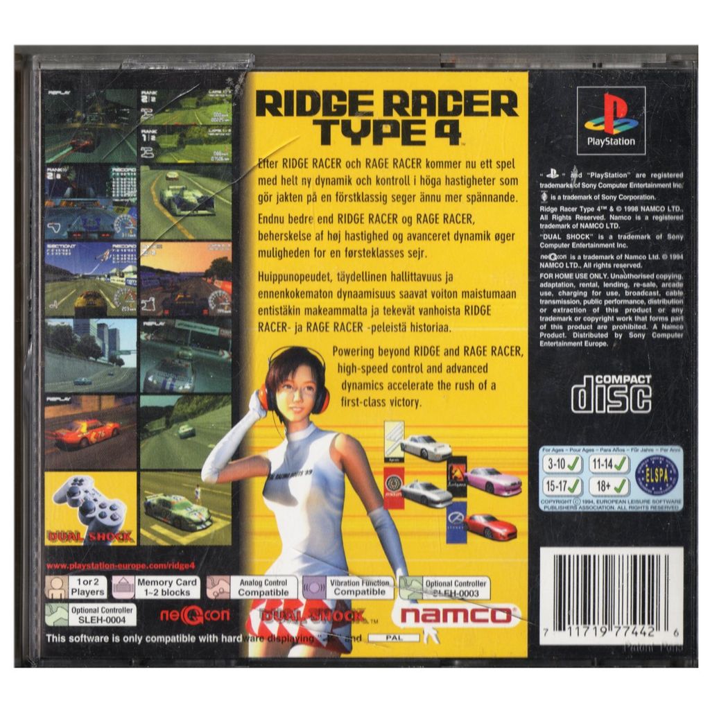 Beskrivning av RIDGE RACER TYPE 4 + RIDGE RACER HI-SPEC DEMO PS1