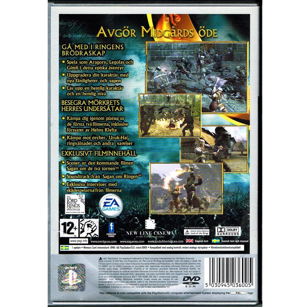 Precis som väntat av namnet är det här spelet direkt länkat till Peter Jacksons De två tornen-filmen, men det tar inte slut där. Nej då, EA har även tagit med lika mycket action från 2001-toppfilmen, Härskarringen. Generöst, eller hur? Spelet är en slags Golden Axe för den nya generationen, och är en slaktfest i tredjepersonsperspektiv där du kämpar mot orcharméerna i rollen av en av de tre brödraskapshjältarna: Aragorn, Legolas eller Gimli. Ta din hjälte genom de stora, kronologiskt ordnade stridsscenerna från de två filmerna i din kamp att hålla Frodo och härskarringen säkra från Sauron och hans anhängare samtidigt som du själv försöker överleva. Du kan förvänta dig autentiskt återskapad filmaction och en drakskatt av extramaterial.
