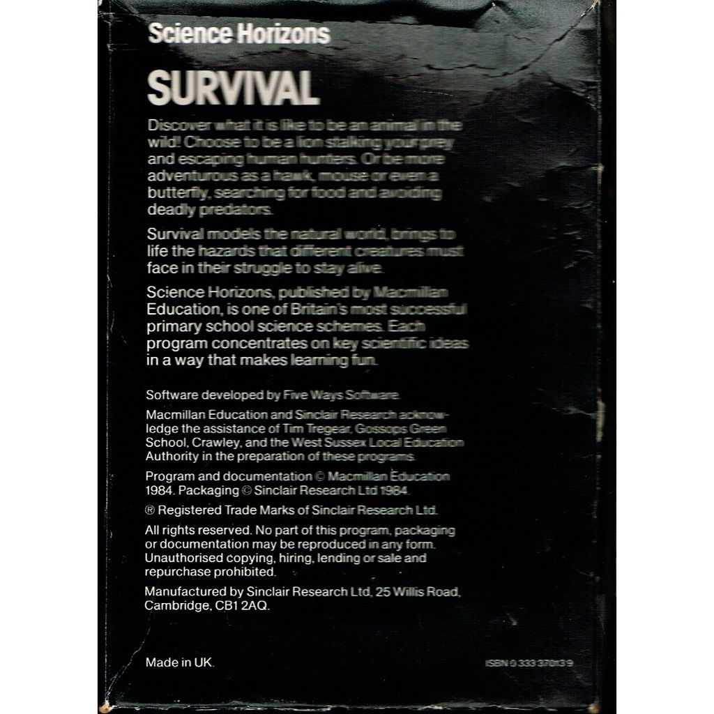Science Horizons Survival is a ZX Spectrum computer game developed by Five Ways Software. It was published by Sinclair Research in association with Macmillan Education in 1984. It is an educational game in which the player takes on the role of one of a series of animals, and had to find food to survive while avoiding predators.