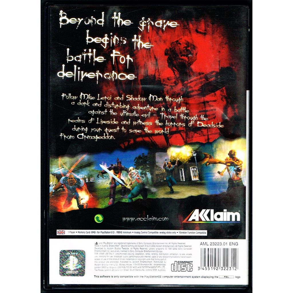Shadow Man: 2econd Coming is an action-adventure video game developed by Acclaim Studios Teesside and published by Acclaim Entertainment for the PlayStation 2. It is a sequel to the 1999 video game Shadow Man and, like the previous game, is based on the Shadowman comic book series published by Valiant Comics.