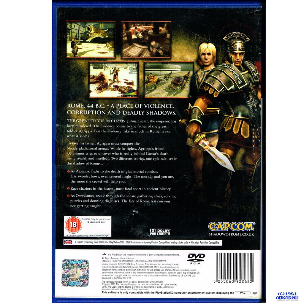 Shadow of Rome (Japanese: hadō obu Rōma) is a 2005 hybrid hack and slash/stealth video game, with elements of vehicular combat, developed and published by Capcom for the PlayStation 2. The game was released in Europe and North America in February, and in Japan in March.