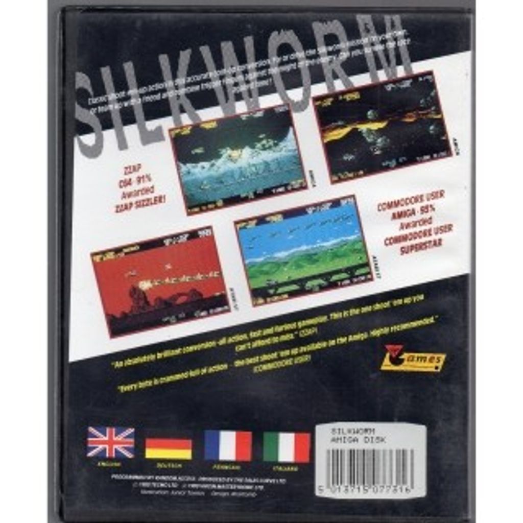 Silkworm is a classic side scrolling shooter, developed by Tecmo and first released for arcade in 1988. In 1989 it was ported to the Amiga, Atari ST, Commodore 64, ZX Spectrum, Amstrad CPC and NES (1990) systems by The Sales Curve and released by Virgin Mastertronic.