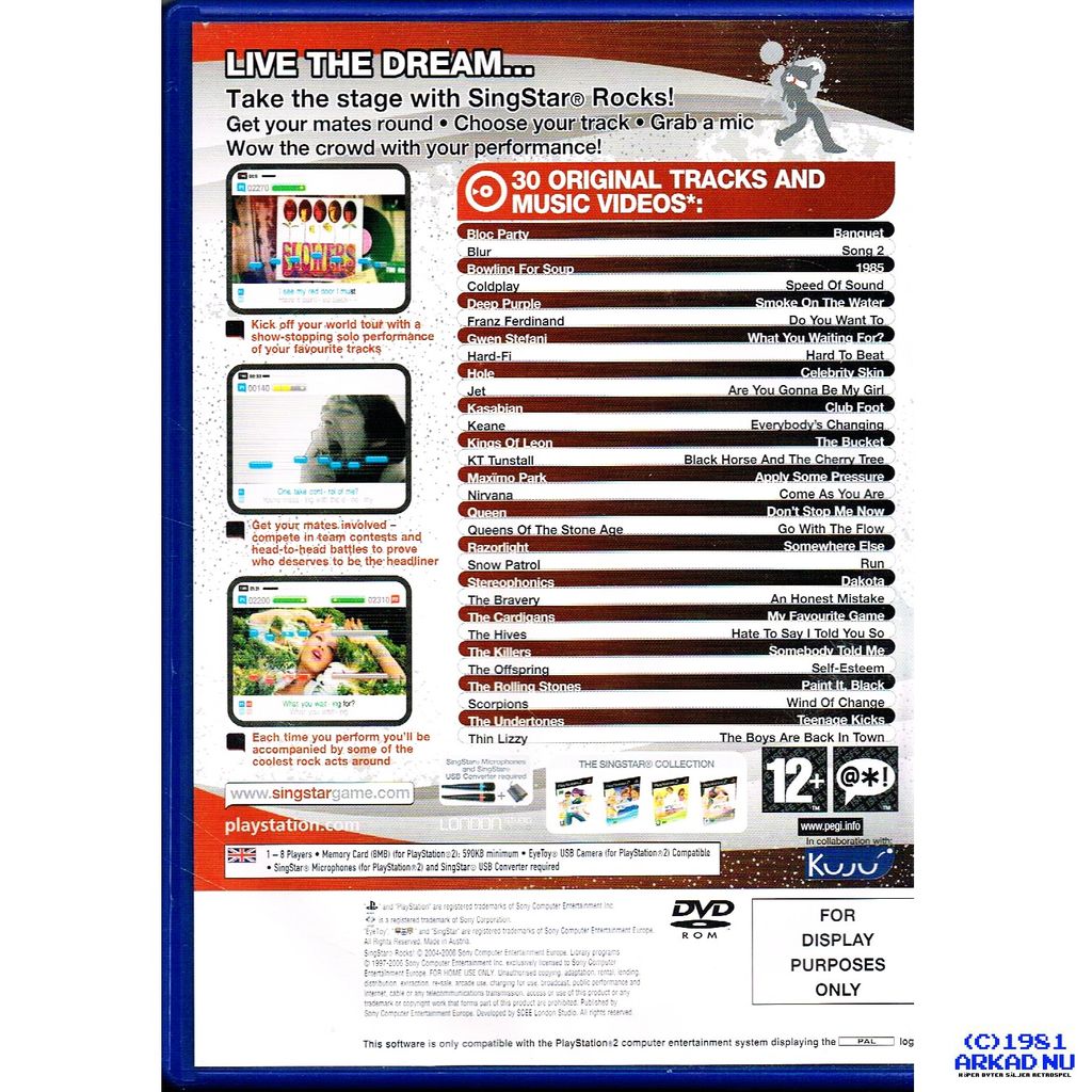 Singstar Rocks! , som innehåller alla originalvideor, fångar känslan och energin från världens bästa spelningar. Nu får du äntligen känna hur det är att vara en riktig toppartist. Så om du tycker att du har rätt attityd och stil för att sjunga i några av världens respekterade live-band kan du med SingStar Rocks! framföra den ultimata spelningslistan - oavsett var du och din PlayStation 2 råkar vara.