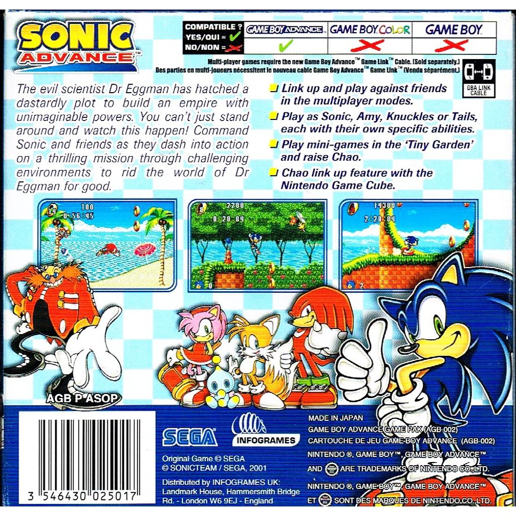 Sonic Advance (Sonikku Adobansu) is a 2001 platform game in the Sonic the Hedgehog series, developed by Dimps and Sonic Team and published in Japan by Sega for the Game Boy Advance. It was later published by THQ in North America and by Infogrames in PAL regions. It was released in Japan on December 20, 2001, in North America on February 3, 2002 and in PAL regions on March 8, 2002. There were also releases on three Twin Pack cartridges bundled with Sonic Pinball Party, Sonic Battle and ChuChu Rocket! respectively in 2005. It was one of the first Sonic games to be released on a Nintendo platform.