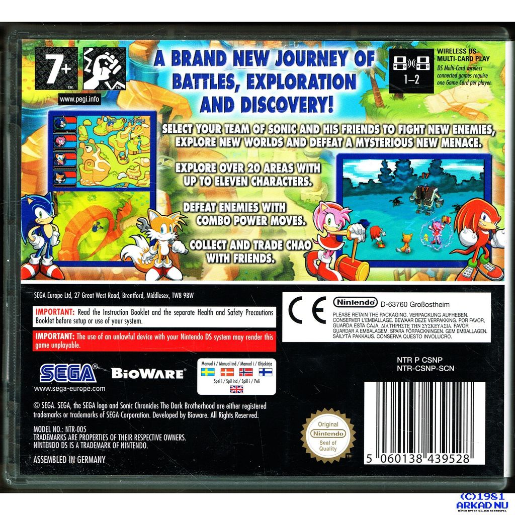 Sonic and his friends band together to defeat a menacing new enemy in a distinctly new game that includes combat, skill, collectibles and puzzles, exclusively on the Nintendo DS. For Sonic's premier debut in the genre, leading RPG developer, BioWare (Mass Effect, Star Wars: Knights of the Old Republic) has created a slick blend of strategy and speed with fast-paced battles, character and party customization, and the ability to collect and trade items via DS wireless. Players will need to keep their wits about them at all times, as they will never know what will get them through the next challenge. With an engaging storyline, lightning fast attacks, high production values and impeccable visuals, Sonic Chronicles: The Dark Brotherhood allows gamers to experience Sonic in a whole new way.
