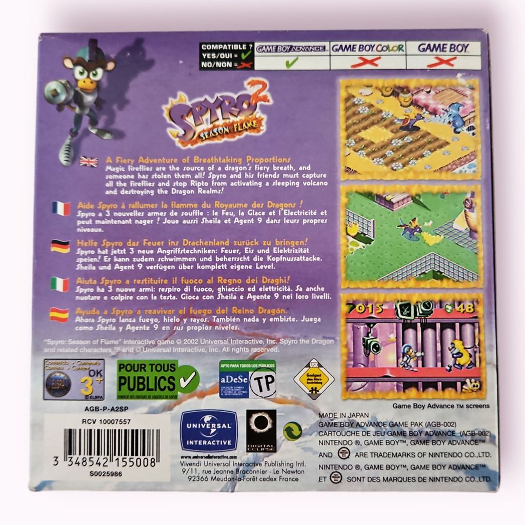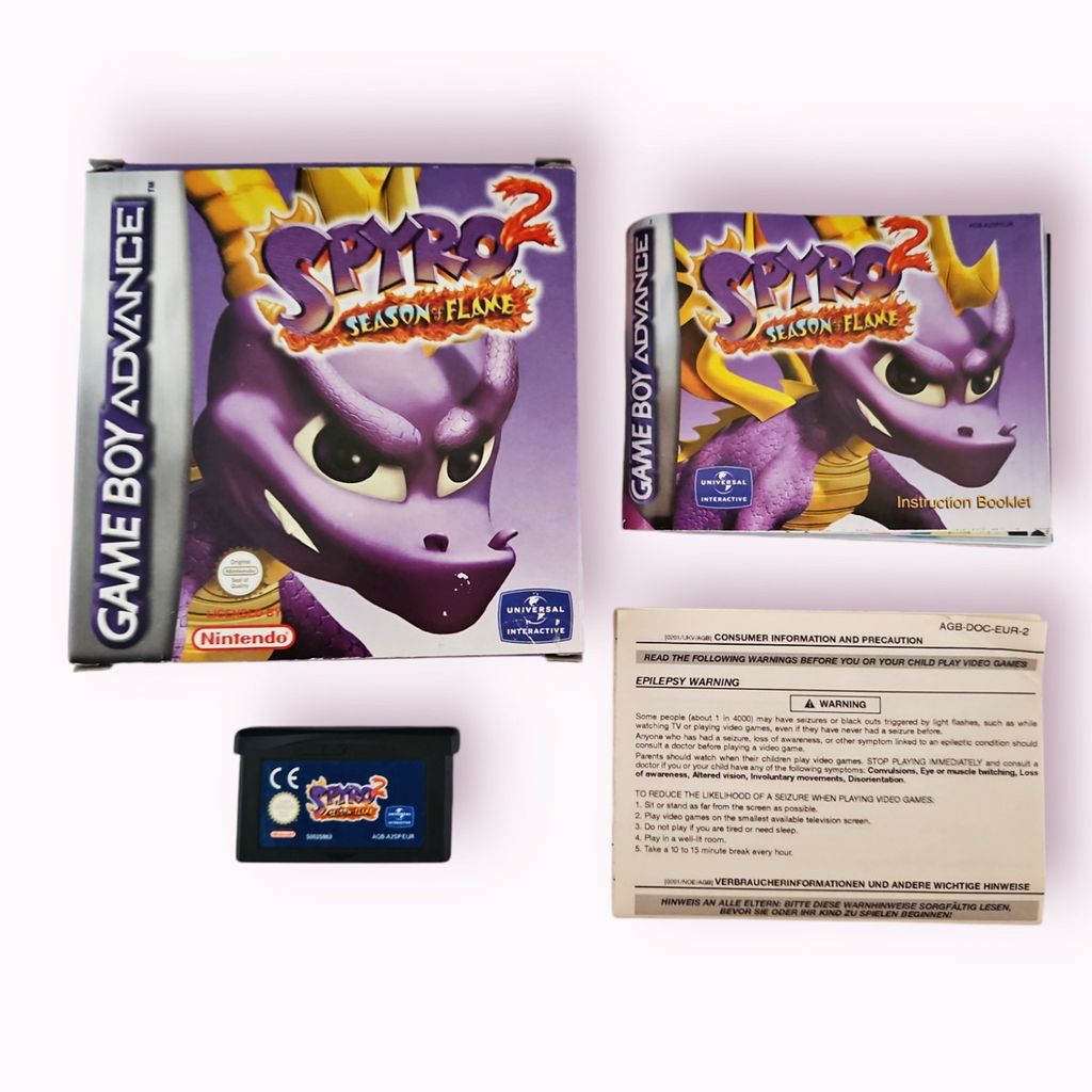 Spyro 2: Season of Flame is a platform game developed by Digital Eclipse and published by Universal Interactive for the Game Boy Advance. It was released in 2002 in North America and in the PAL regions. Unlike the first Spyro game on the GBA, it was not released in Japan for an unknown reason.