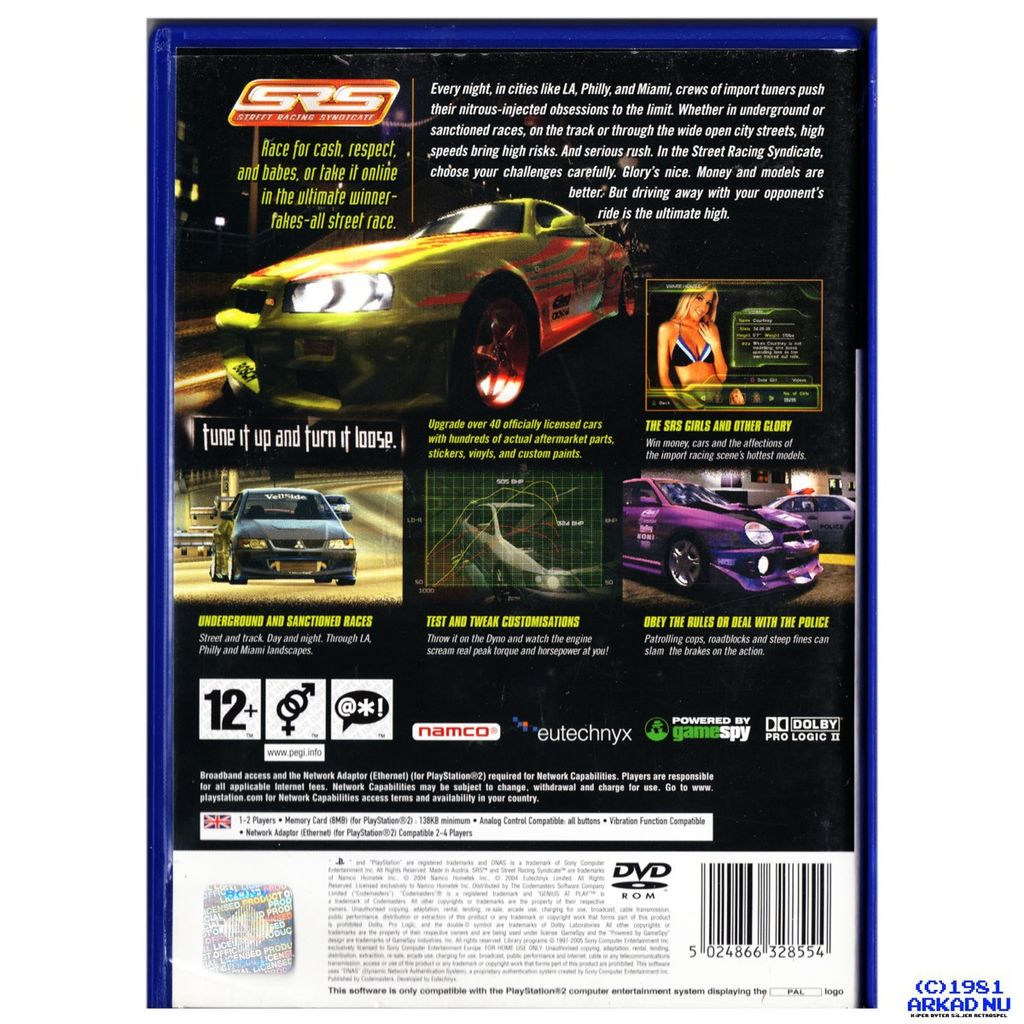 SRS: Street Racing Syndicate is an arcade racing game, offering more than 50 licensed cars, which are tunable with licensed tuning parts. The player races on tracks situated in Los Angeles, Miami and Philadelphia, both during daylight and at night. It's also possible to date 18 cute models, each with their own video clips.