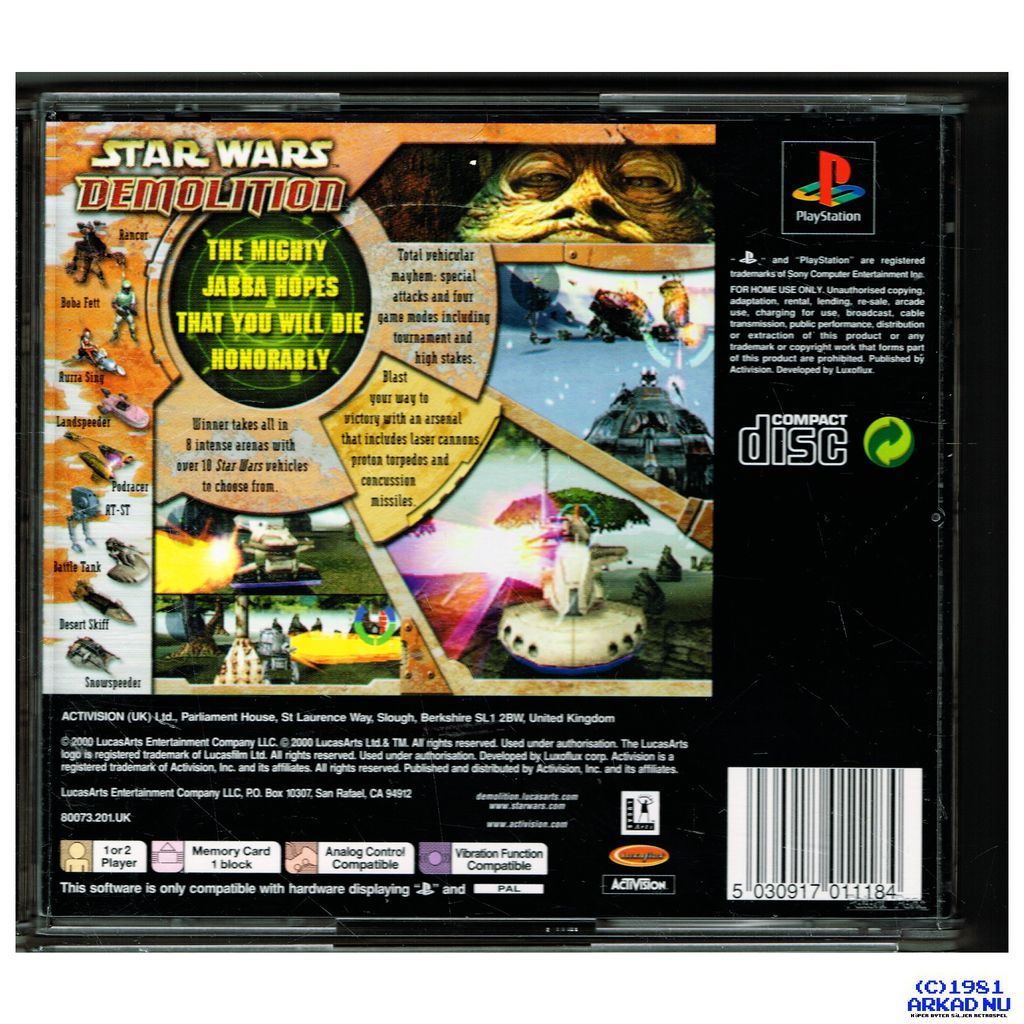 Star Wars: Demolition is a vehicular combat game set in the Star Wars universe created by both Luxoflux and LucasArts using the Vigilante 8 game engine. The story of it occurs after the Empire declares they've officially banned Jabba the Hutt's podraces but nevertheless Jabba creates a more life-threatening contest similar to Twisted Metal to take over the position of podracing. This game had been released on both the Sony PlayStation and the Sega Dreamcast. It was released on PlayStation on November 12, 2000 and on November 19, 2000 for the Dreamcast.