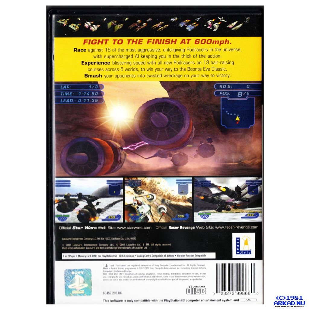 It has been eight years since the first spectacular Podracing showdown between Sebulba and the young Anakin Skywalker. Seeking payback for his humiliating loss, Sebulba has a new beefed-up Podracer and lust for revenge. But it's not going to be easy: Anakin has grown into a boldly skilled Podracer pilot. Thus the stage is set for Star Wars® Racer Revenge’, bringing newer, faster, and even more dangerous Podracing to the galaxy-taking you on a one-way ride to ultimate victory. Jockey for position with a tangle of Podracing opponents or leave the pack behind at intense, nerve-jangling, planet-scorching simulated speeds of up to 600 mph. Crash and bash competitors into oblivion as you take them out of the race for good. Get down and dirty against 16+ of the most aggressive Podracers in the galaxy and smash your opponents into twisted wreckage