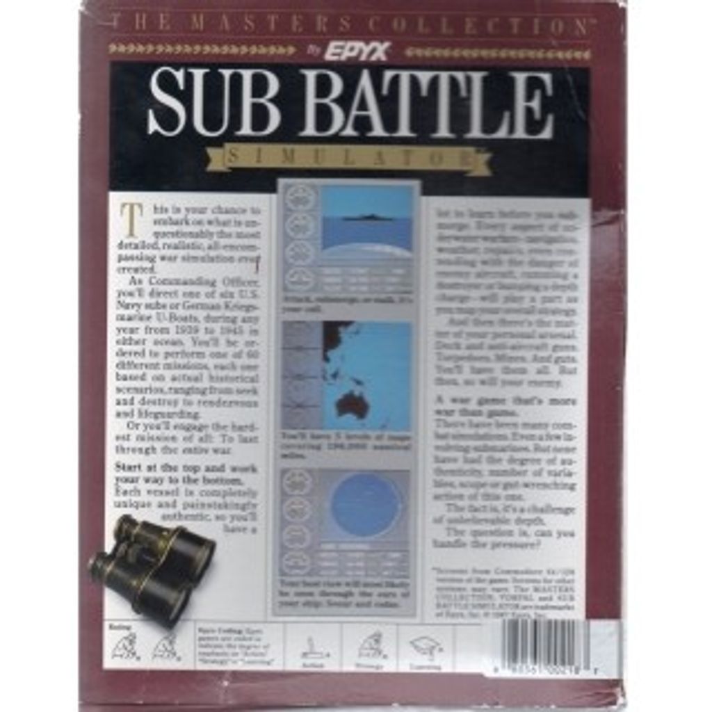 Sub Battle Simulator sets the action in times of World War 2, with the player on the American or German side. There are 36 German missions and 24 American missions in which the player can command six different submarines. The player is responsible for navigation, using five different levels of mapping, attacks' planning based on weather and surroundings as well as paying attention to the radar. The game gives the possibility to play underwater or on the surface. A player can choose target practice, individual missions or war commands as either a German or an American submarine Captain. Using DOSBox and the latest version of SDL.DLL this game runs perfectly under Windows 8, if DOSBox is correctly configured.