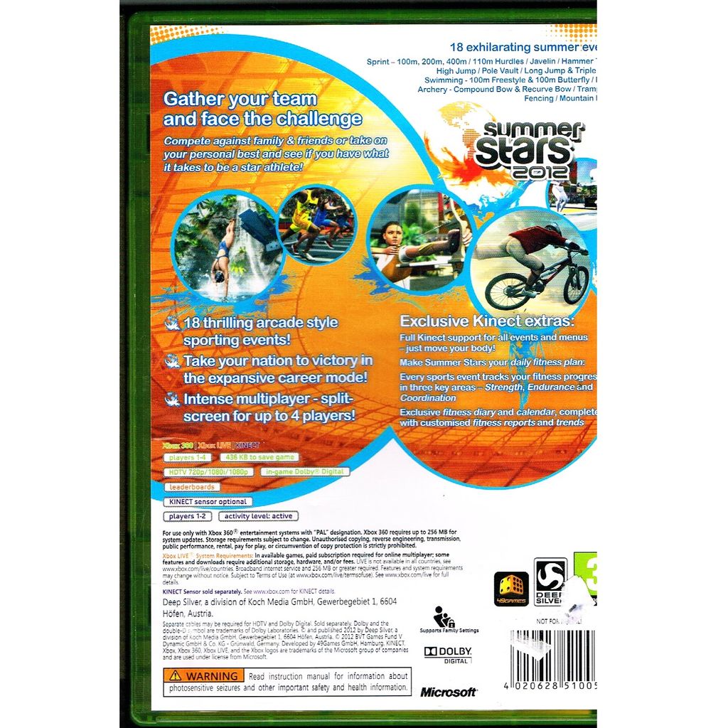 With more than 18 different disciplines & challenges, Summer Stars covers a whole range of summer sports. Players can prove their talent in disciplines like Triple Jump, Mountain Biking, Diving or Sprinting and become a top athlete in the career mode. In multiplayer mode, they can compete directly with up to three friends or family members on split screen - delivering a gripping "just one more go" experience. Summer Stars also leaves it up to the players to decide how far they will be physically involved in the gameplay: the game supports traditional arcade-style controls, as well as motion control via Kinect for Xbox 360, PlayStation Move or Wii.
