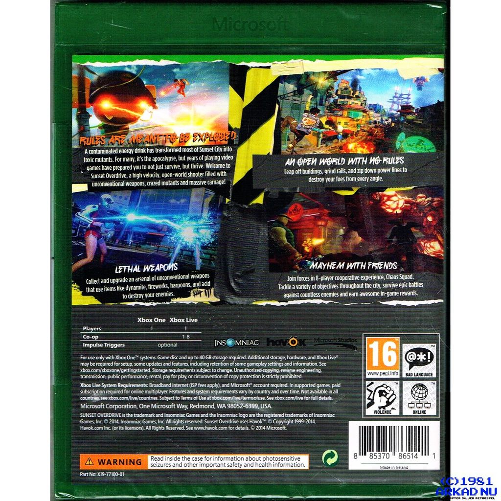 Utvecklat exklusivt för Xbox One, "Sunset Overdrive" är en skiftande, öppen världs shooter i den inte så långa framtiden. En katastrofal händelse har lämnat din stad invaderad av mutanter. Medan majoriteten förgås eller omvandlas, blomstrar du. Det visar sig att dina anrop inte tar upp skräp eller serverar mat, det är mutant förstörelse. Med en arsenal av överlägsna vapen och en förmåga att korsa staden med hyperagilitet, är det inte slutet av dagarna för dig. Din historia är bara början.