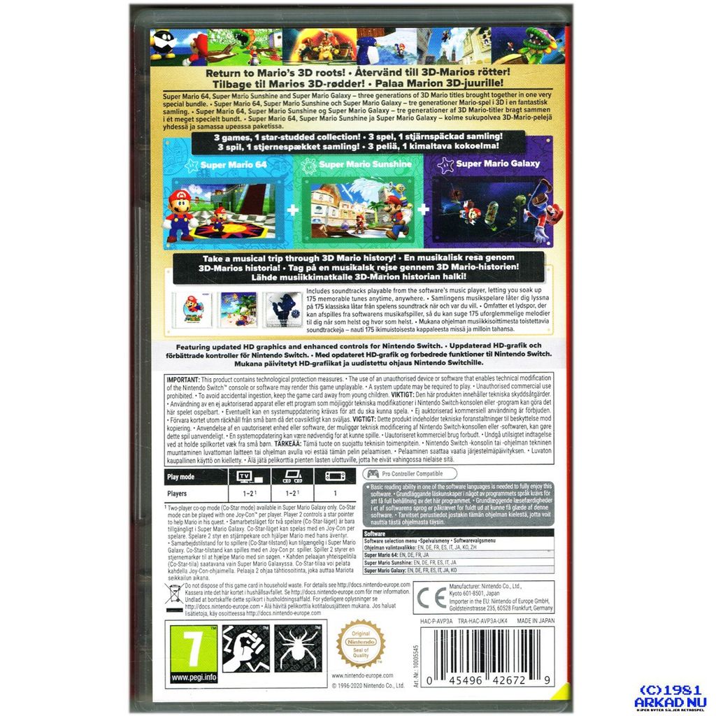 Upptäck (eller återupptäck) tre av Marios mest ikoniska 3D -plattformsäventyr, allt i ett paket, tillgängligt på Nintendo Switch ™ -systemet. Upplev Marios första strejk mot 3D -plattform i Super Mario 64 ™ -spelet, som ursprungligen släpptes 1996. Vägghopp, backflip och till och med flyga när du utforskar målningar och samlar Power Stars för att rädda Princess Peach!