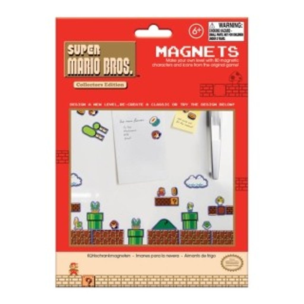 Super Mario Bros Kylskåpsmagneter består av 80 st magnetiska karaktärer och ikoner från 8-bitars tv-spelet Super Maro Bros. Bland annat finns Mario, Luigi, svampar, sköldpaddor, blommor, mynt och avloppsrör samt mark och tegelstenar så du kan skapa helt nya världar i klassiskt 8-bitarsutförande.