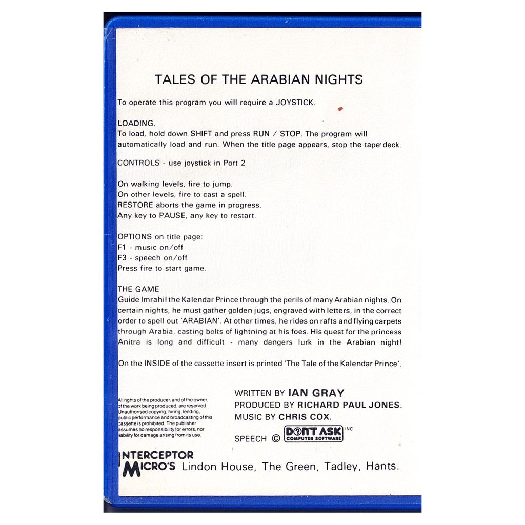 Beskrivning av TALES OF THE ARABIAN NIGHTS C64 KASSETT