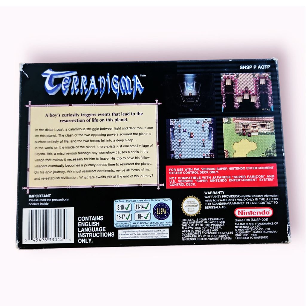 Terranigma is an action role-playing game. Ark levels up after having completed an important quest or cleared out an area. He can attack enemies with various weapons, using different techniques: pierce, leap, dash, etc., resulting from the combination of three basic actions - attacking, running, and jumping. Special objects called Magirocks can be collected and converted into rings, which act as one-use items capable of casting magic spells.