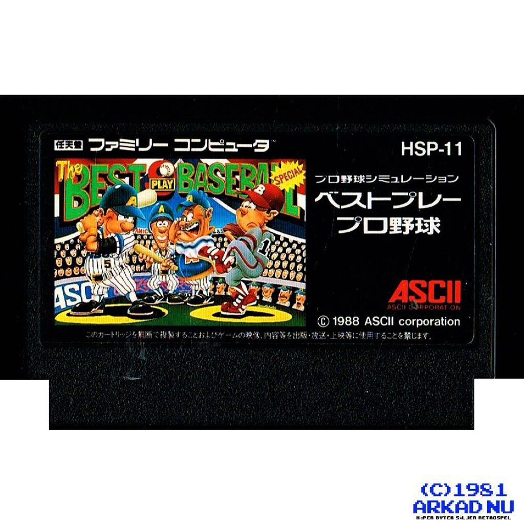 Best Play Pro Yakyuu (lit. Best Play Pro Baseball) is a baseball game developed by ASCII Entertainment for the Famicom, and published in Japan in 1988. It is the first game in the Best Play Pro Yakyuu series. Unlike similar baseball games developed for the Famicom, this game has a particular emphasis on baseball management simulation, as opposed to focusing on the skill of playing baseball. As a result, players do not actually hit, pitch, or field the ball. Rather, their interaction in the game is accomplished by changing lineups and alternating pitchers and fielders in order to give your team the best chance it has in winning a league pennant race. An updated version of the game (referred to as "Shin Data") was published on October 11, 1988, which contained updated information about each team's players. Both versions of the game were only released in Japan, and have never been translated from the original Japanese.4