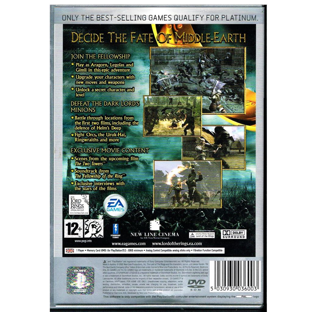 Precis som väntat av namnet är det här spelet direkt länkat till Peter Jacksons De två tornen-filmen, men det tar inte slut där. Nej då, EA har även tagit med lika mycket action från 2001-toppfilmen, Härskarringen. Generöst, eller hur? Spelet är en slags Golden Axe för den nya generationen, och är en slaktfest i tredjepersonsperspektiv där du kämpar mot orcharméerna i rollen av en av de tre brödraskapshjältarna: Aragorn, Legolas eller Gimli. Ta din hjälte genom de stora, kronologiskt ordnade stridsscenerna från de två filmerna i din kamp att hålla Frodo och härskarringen säkra från Sauron och hans anhängare samtidigt som du själv försöker överleva. Du kan förvänta dig autentiskt återskapad filmaction och en drakskatt av extramaterial.